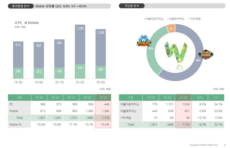 더블유게임즈(192080) weekly IR의 변화(FEAT.염차장, 염블리) (4) 2020.12.15 더블유게임즈(192080) 2020년 3분기 보고서 review (0) 2020.11.21 더블유게임즈(192080) 2분기 실적 및 IR체크 (0) 2020.07.27 더블유게임즈(192080) 임원 매도 및 소음 (0) 2020.07.10 더블유게임즈(192080) 나스닥 상장 공시 (0) 2020.06.04