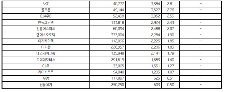 sk텔레콤, skc, 이지웰, 한독크린텍, 우양 등..