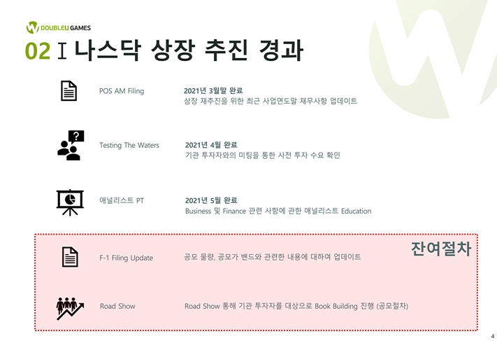 =>안녕하세요 저 역시 나스닥상장이 어렵게 진행되는게 너무나 안타깝습니다. 주관사 교체 흔치않은 일은 주주여러분들에게 당혹스러울것입니다. 회사는 상장포기 아니며 빠른 상장 재개를 위한 작업을 하고있다. 이에대해 주주여러분의 깊은 이해 부탁드립니다. 새로운 주관사와 6년 주가 제자리고 다른 게임사비해 저평가라 계탄스럽다. 저는 더블유게임즈가 다른게임사와는 다른길을 가고있다고 생각한다. 나스닥 상장이 그 길에 불을 밝힐 수 있다고 믿는다. 실망 깊어지기전에 최선다하겠다.