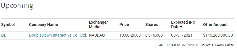 더블유게임즈의 자회사 더블다운인터액티브가 미국 나스닥 기업공개(IPO)를 위한 로드쇼 절차를 개시했다고 26일 밝혔다.회사가 밝힌 주식예탁증서(ADS)당 예상 공모가 범위는 18~20 달러이다. 발