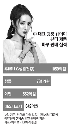 LG생건 '후' 광군제 예약판매 정상급 왕홍 웨이야 효과 톡톡 랑콤·에스티로더 제치고 1위 팬데믹·中업황 타격입은 K뷰티 부진 딛고 부활의 날갯짓 주목 지난달 20일 중국 최대 쇼핑 축제인 광군