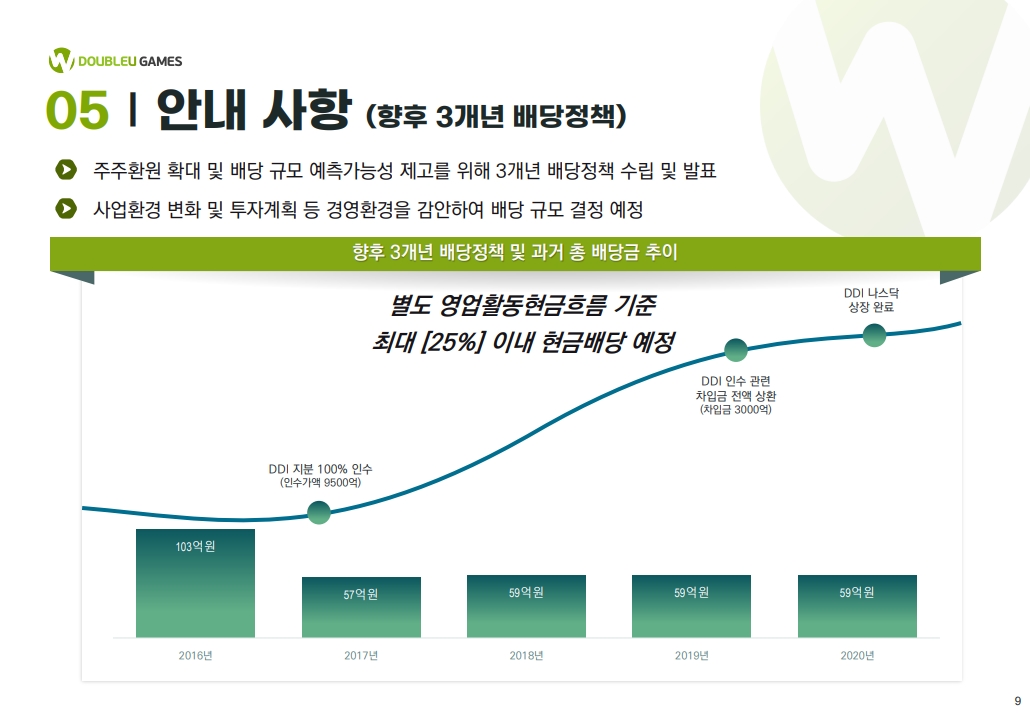 1600억원 가정했을 시 25%면 400억인데 더블유가 작년에 얼마 배당해줬더라?
