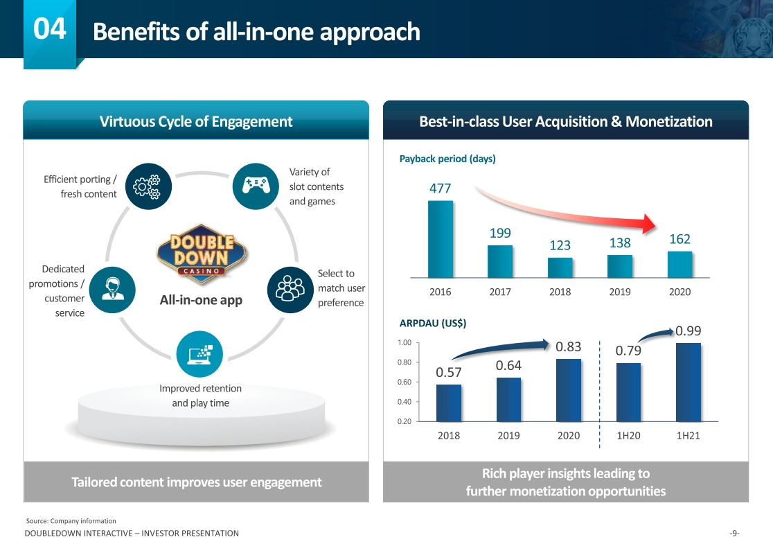 We have what we call an all-in-one approach with our DoubleDown Casino app. We believe that users prefer fewer apps on their smartphones not more so having an all-in-one solution creates better retention, lower user acquisition costs and higher lifetime value. DoubleDown Casino provides a diverse set of offerings to our players, ranging from authentic land-based slots to more casual slot games as well as other casino side games, such as single and table games.