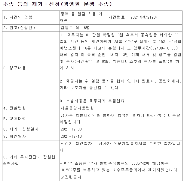 소액주주연대가 회계장부열람등을 위해 소송을했다는 내용이다.