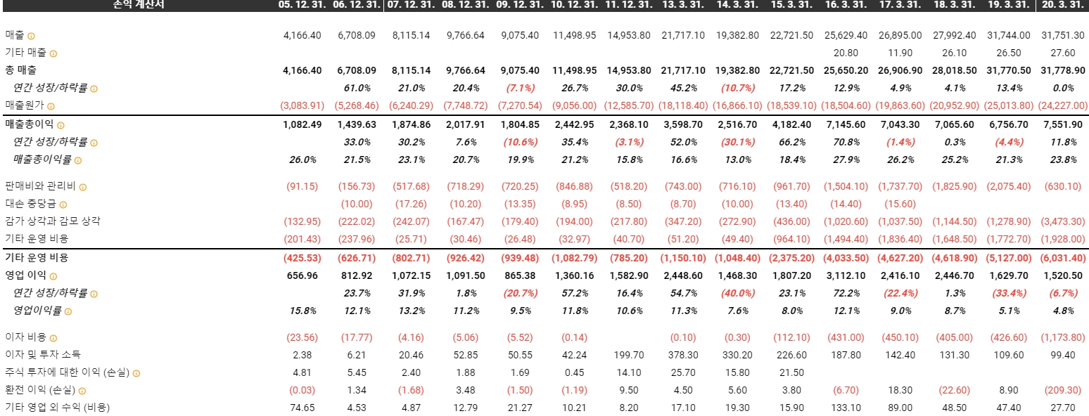 05년부터 20년까지 손익계산서와 현금흐름표를보시면