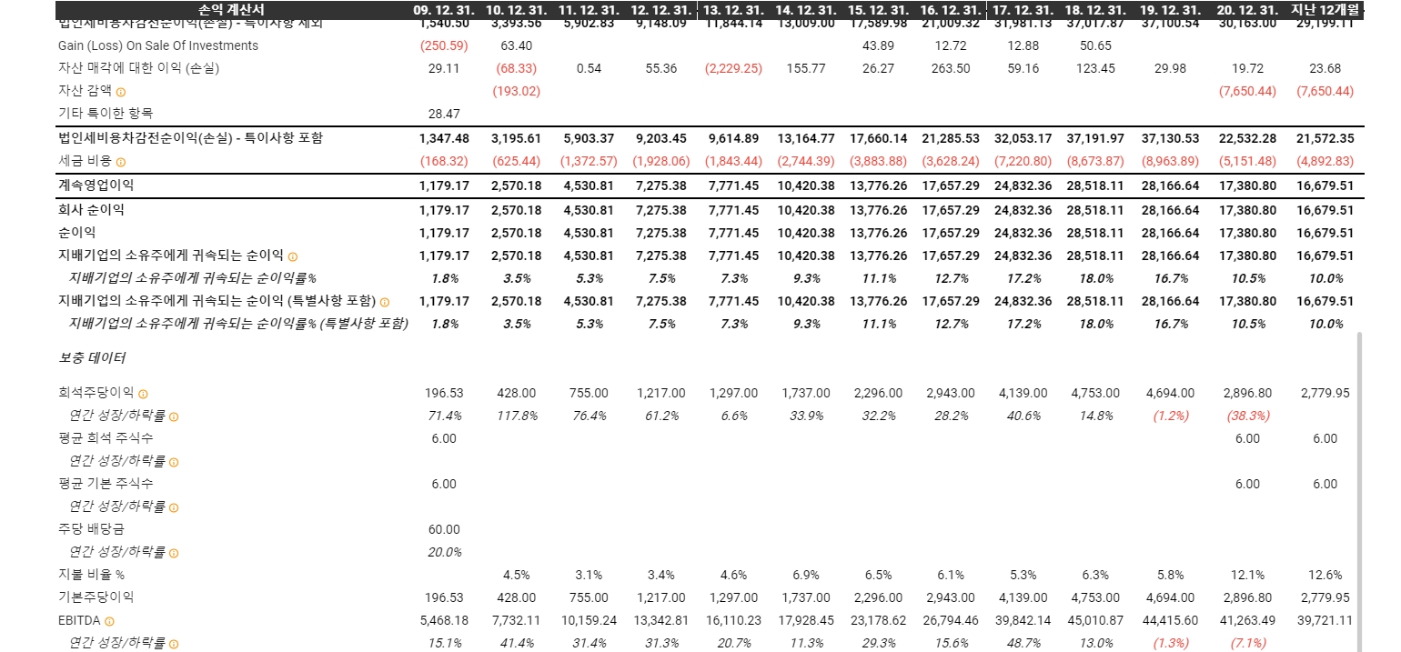 코로나때 이익이 하락한거 말고는 꾸준히 우상향했다.